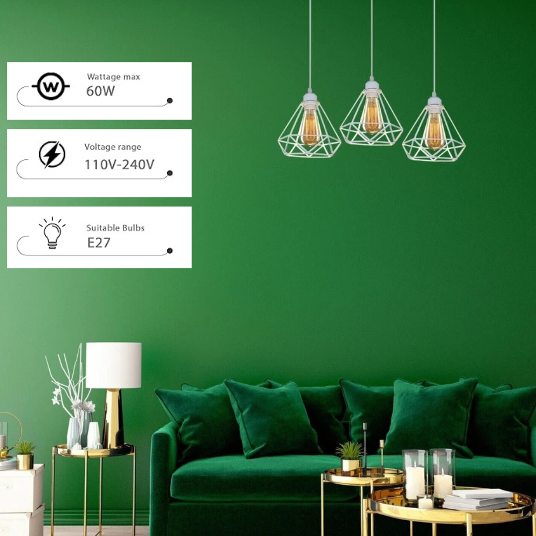 - Elevate your space with the chic, geometric design of the Retro Industrial White Diamond Cage Pendant Light.