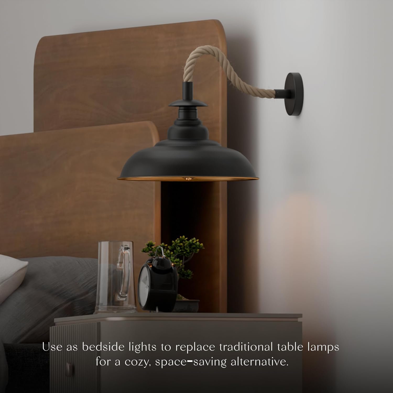 • Elegante aplique de pared de color negro que presenta un cable recubierto de cuerda de cáñamo retorcida con pantalla, ideal para decoración de interiores.
