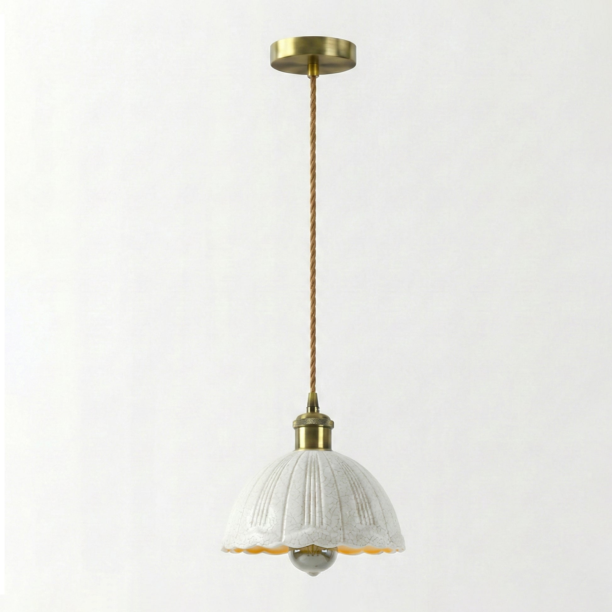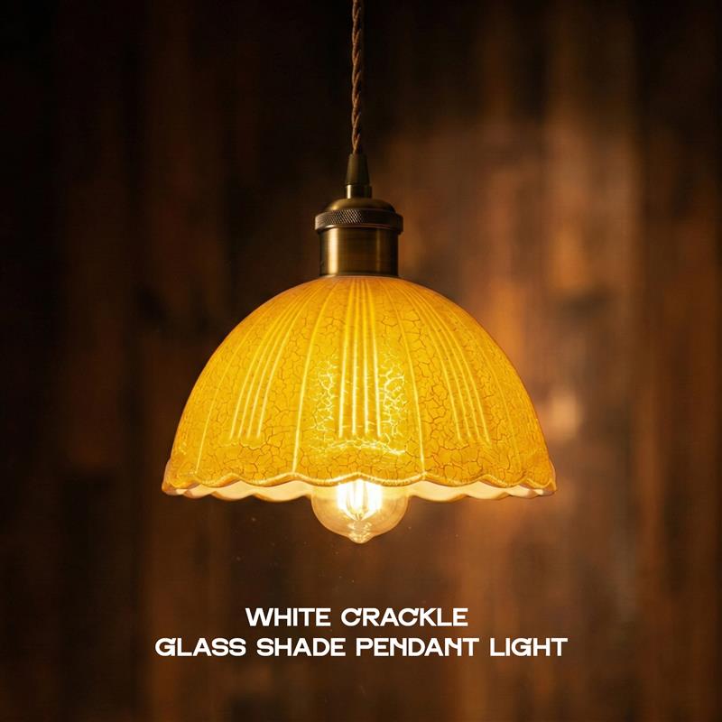 Add a touch of timeless elegance to your home with our White Crackle Glass Scalloped Pendant Light Fixture. Blending vintage charm with modern reliability, this stunning glass pendant light features a beautifully textured white crackle glass shade that casts a warm, inviting amber glow when illuminated.