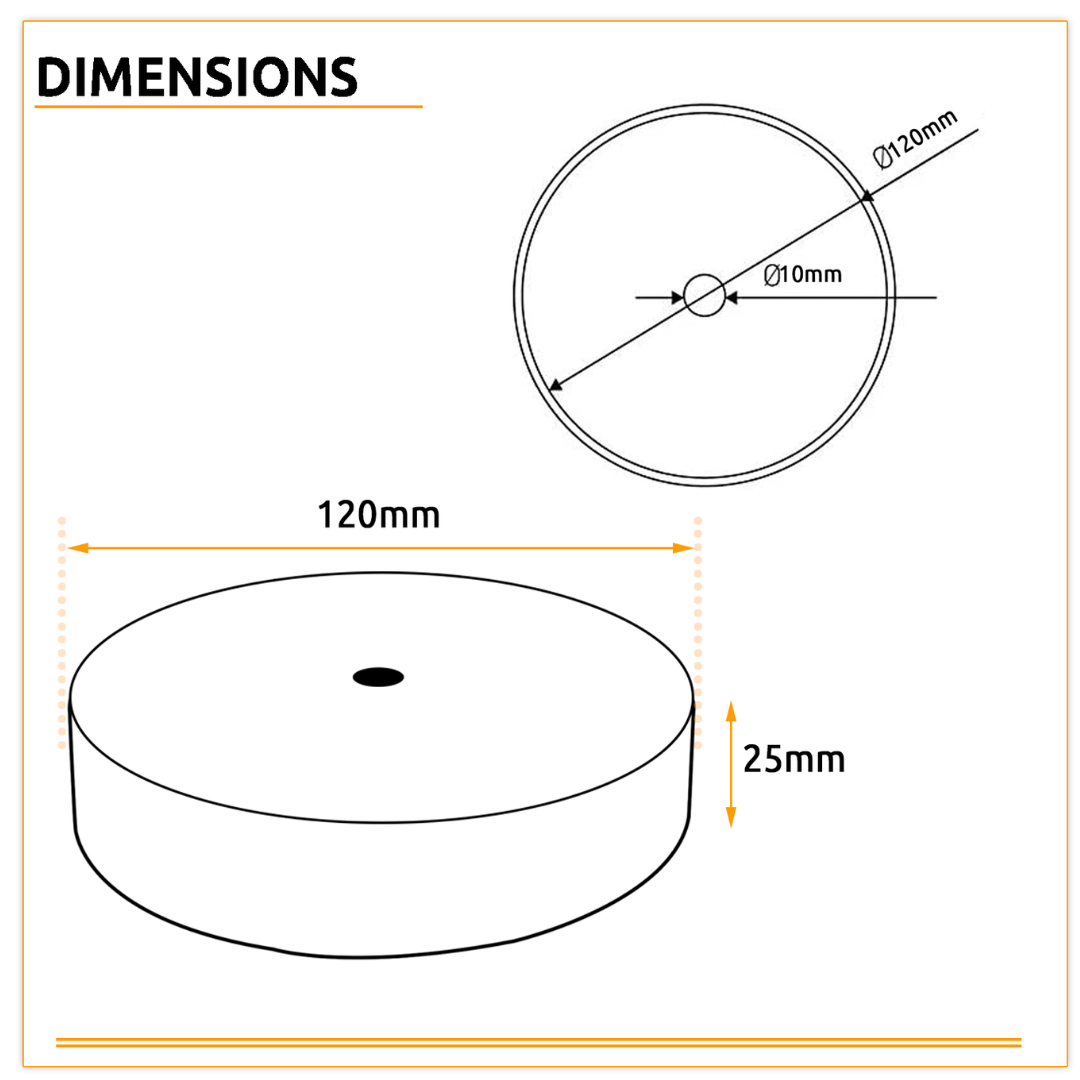 - Soporte de techo con tornillos Dimensiones: 120mm de diámetro 25mm de profundidad.