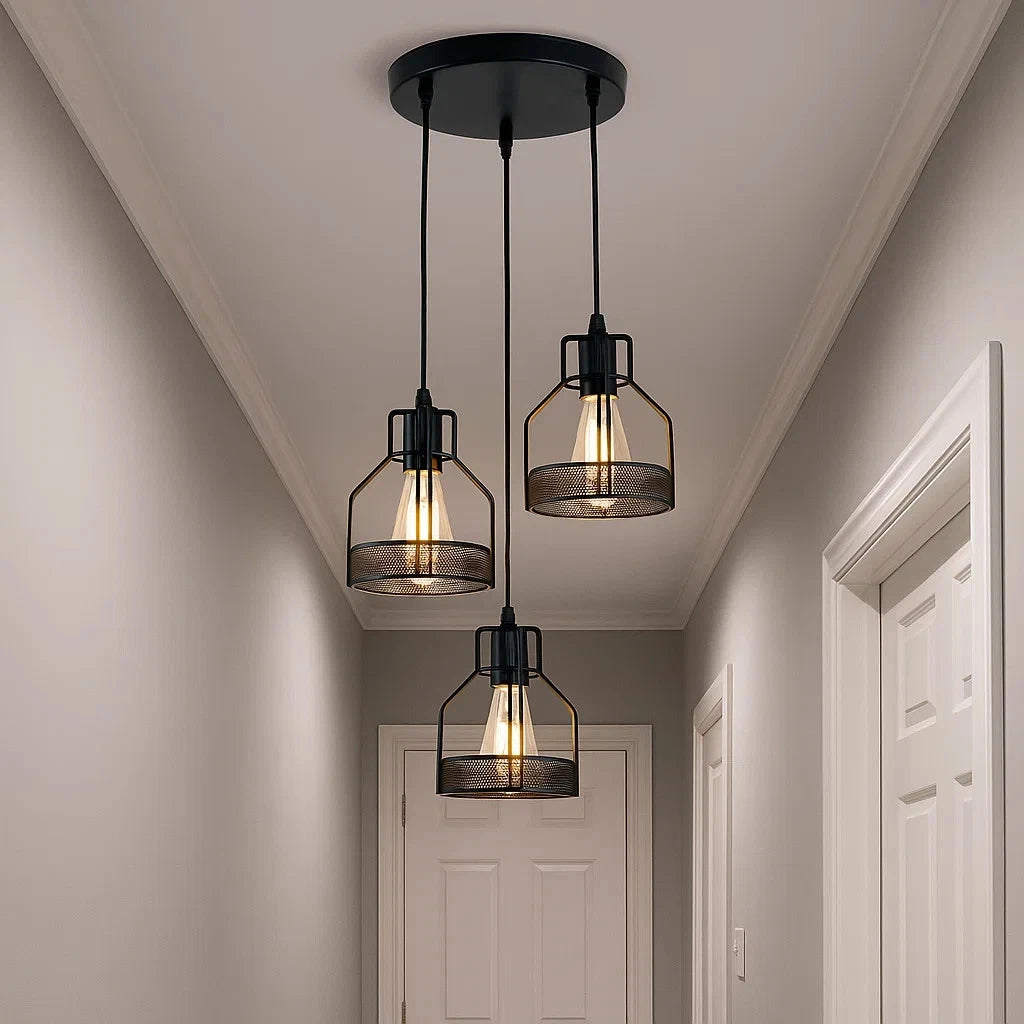 - Deze kroonluchter met 3 lampen combineert traditionele en moderne stijlen, met kappen van getint glas en een strakke, matzwarte afwerking.