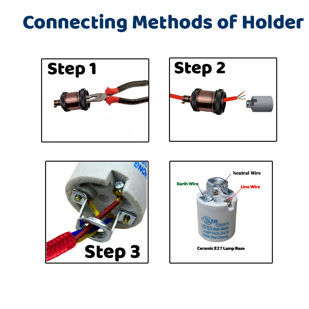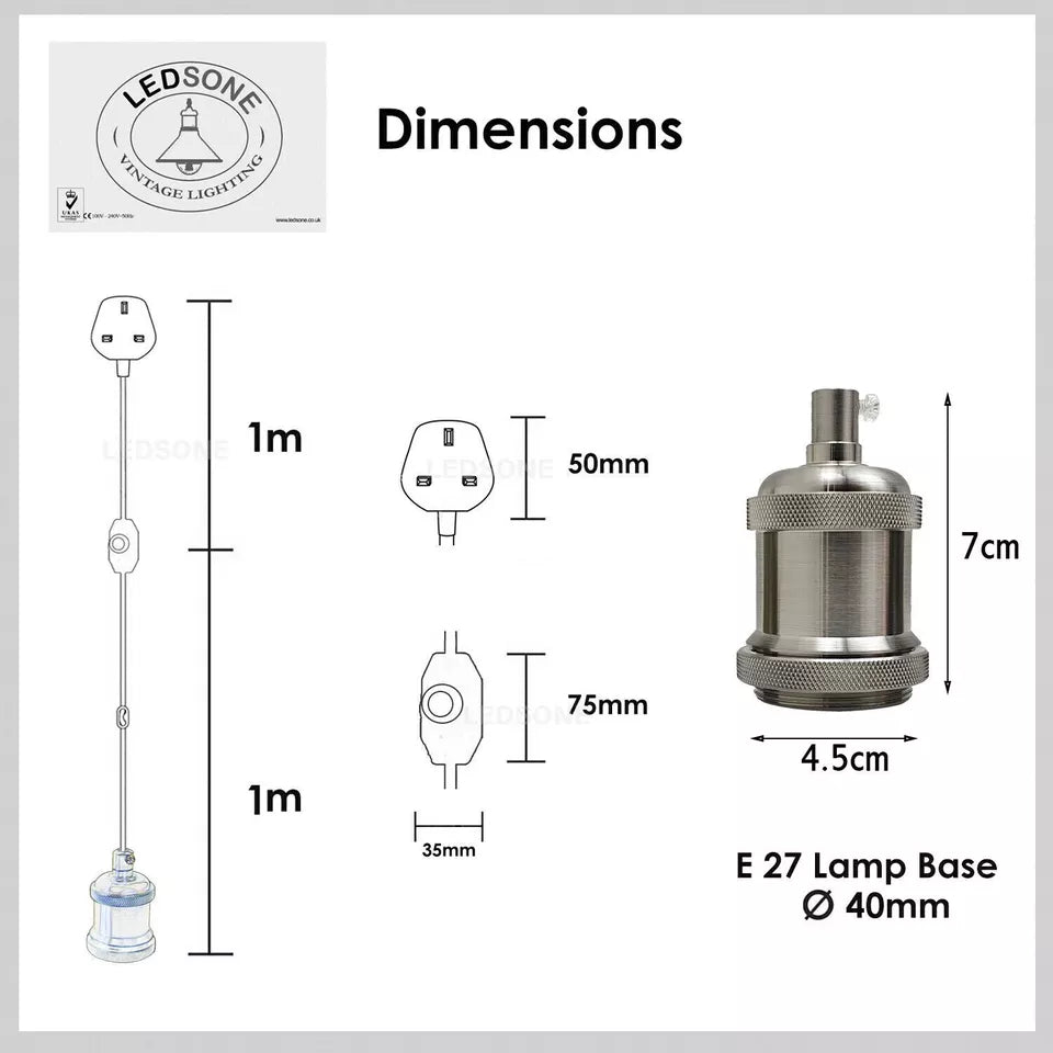 - De set bevat een ES (E27) gegalvaniseerde lamphouder, samen met een 2 meter lange 3-aderige stoffen gevlochten kabel met een 3-pins stekker en een in-line dimmer. U hoeft deze alleen maar aan te sluiten op de lamphouder. Er wordt ook een kabelklem meegeleverd om de kabel op zijn plaats te houden.