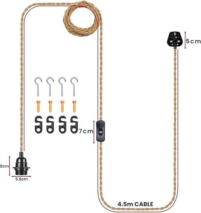 - Ontworpen als inspirerende, stijlvolle hanglamp die een uniek tintje aan uw interieur toevoegt. Gemaakt van verstelbaar henneptouw met een houder voor een aan/uit-schakelaar en een stekkersnoer met een rustieke uitstraling.
