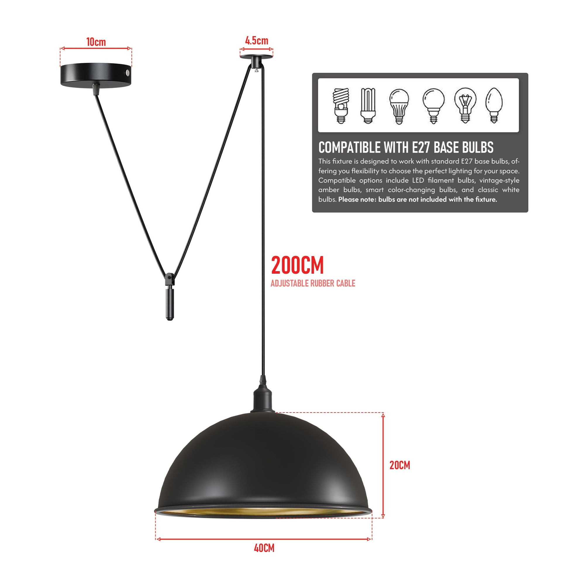 Bring the perfect blend of vintage mechanics and modern style to your home with the Industrial Rise and Fall Pendant Light. This 40cm black dome fixture features a fully functional pulley system, making it an ideal choice for dynamic lighting in kitchens, dining areas, and workspaces.