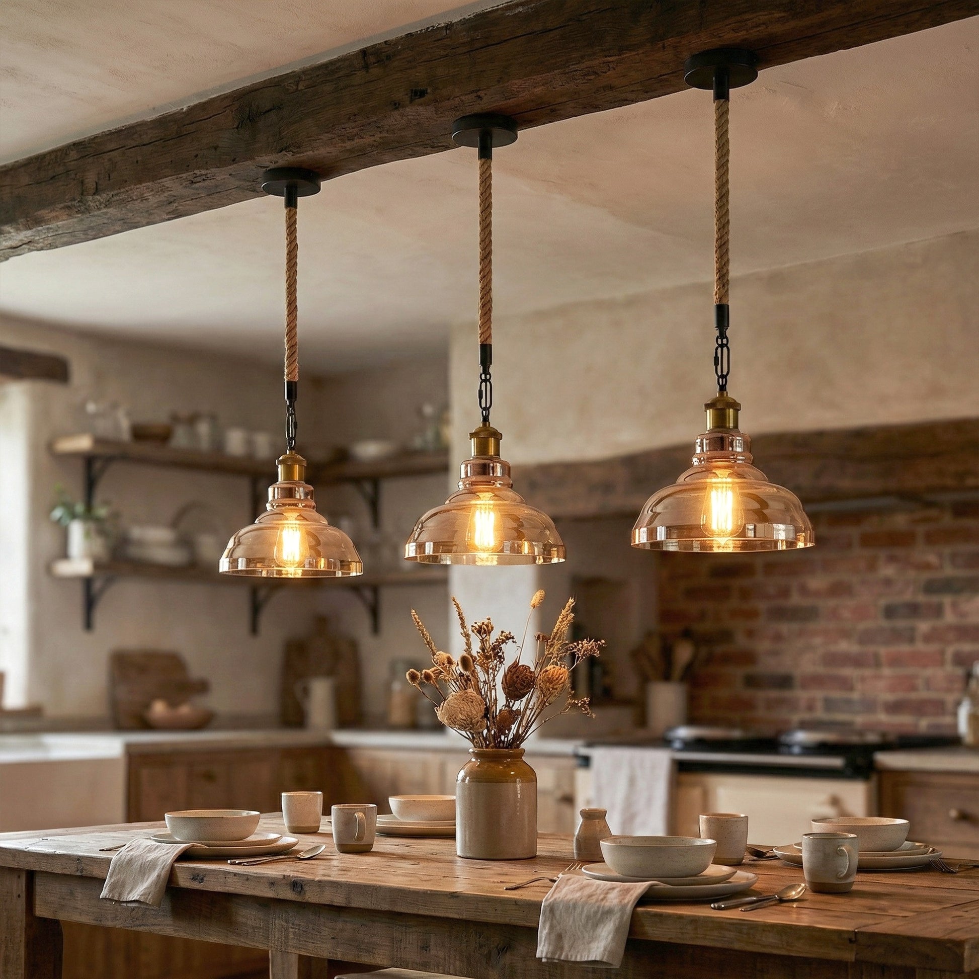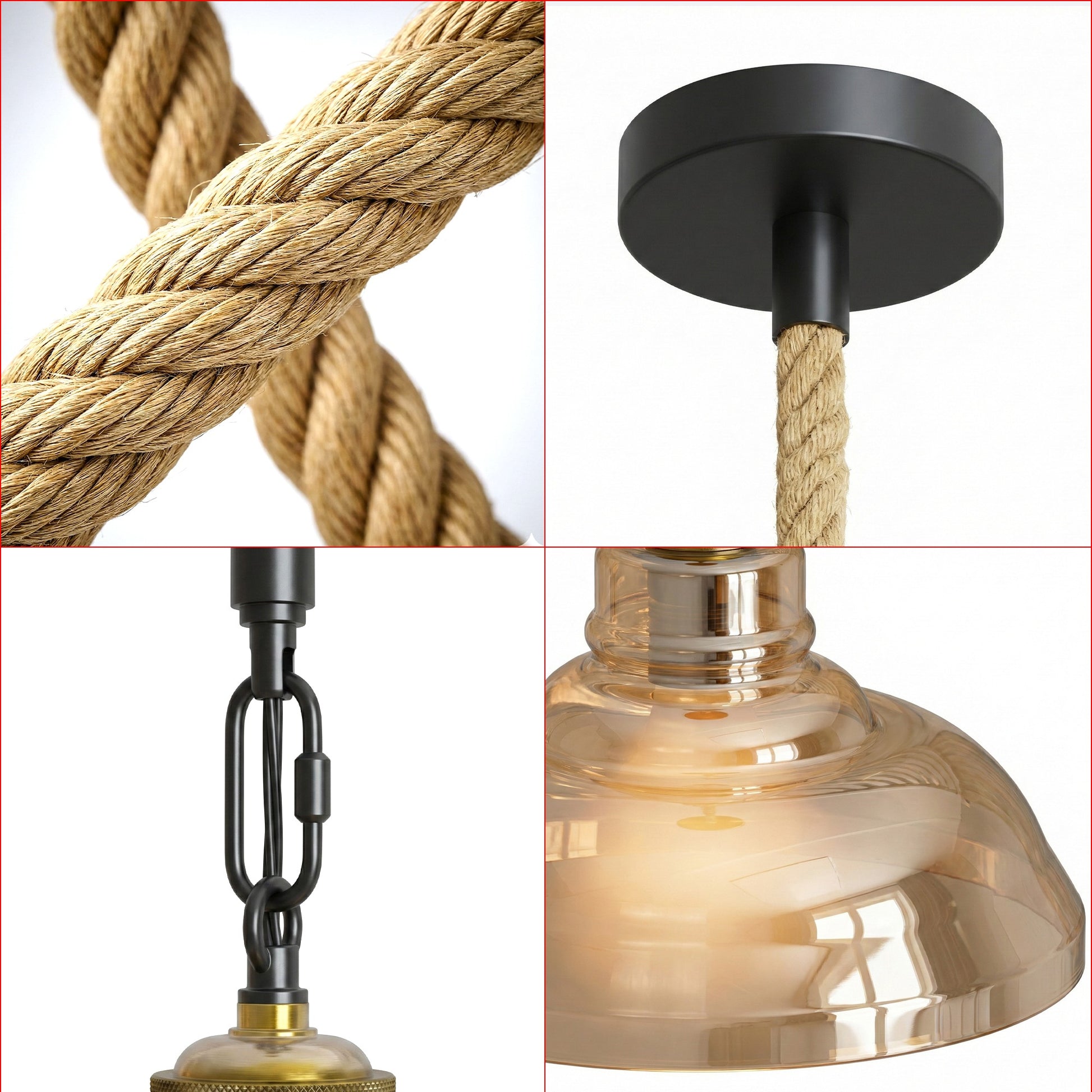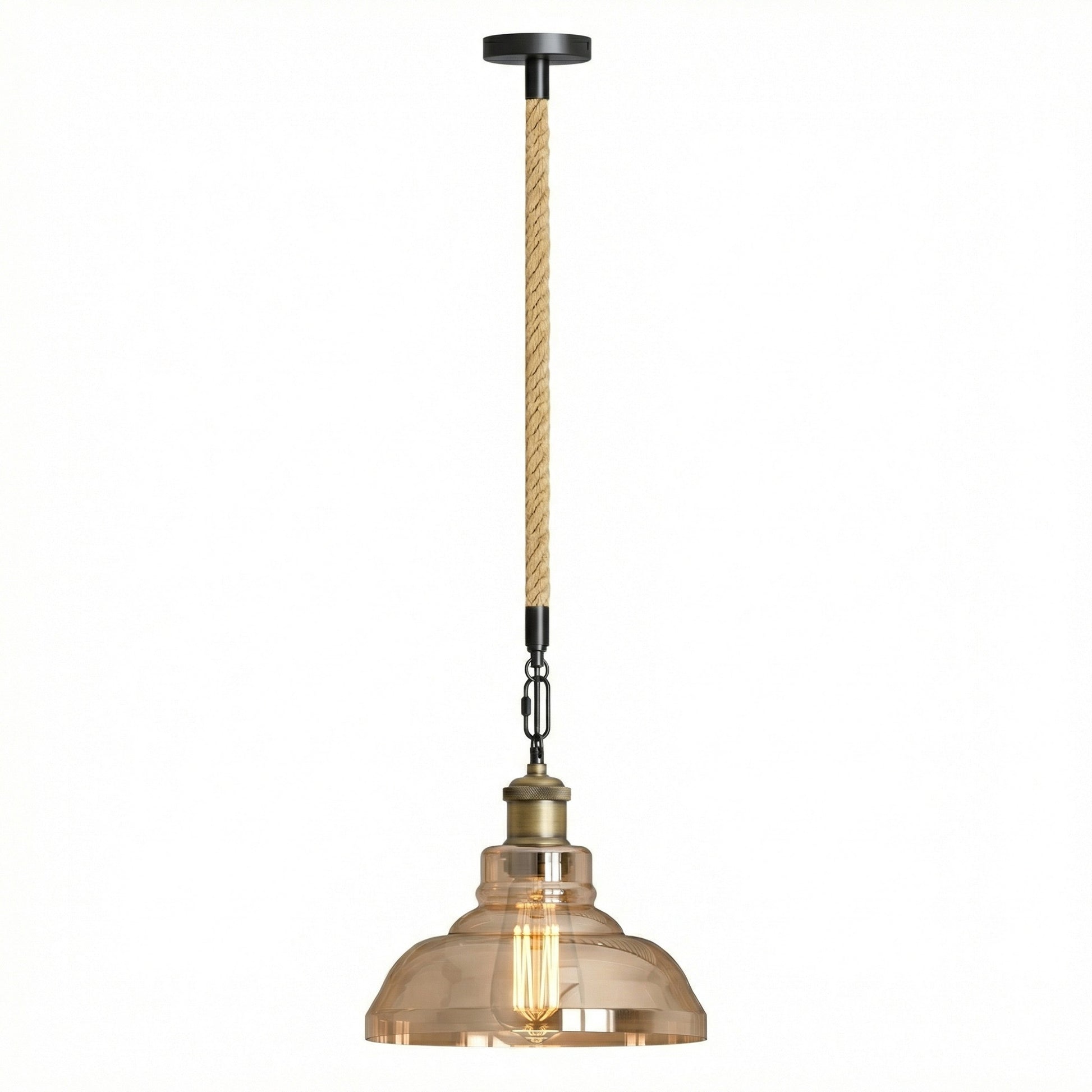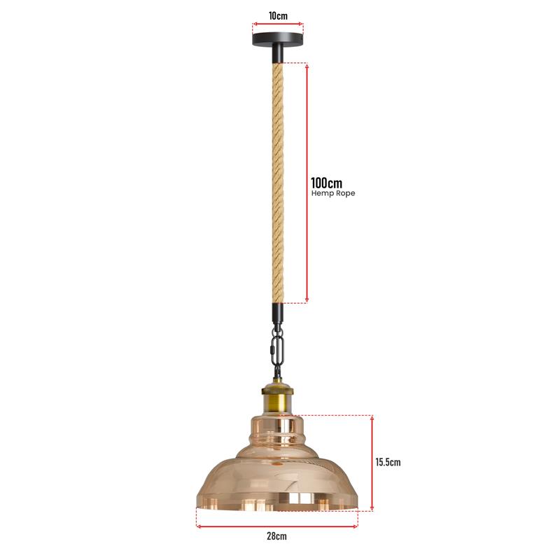 • Designed with a classic glass lampshade, iron fittings, and a 100cm natural hemp rope, this hanging ceiling lamp blends rustic charm with modern industrial style.