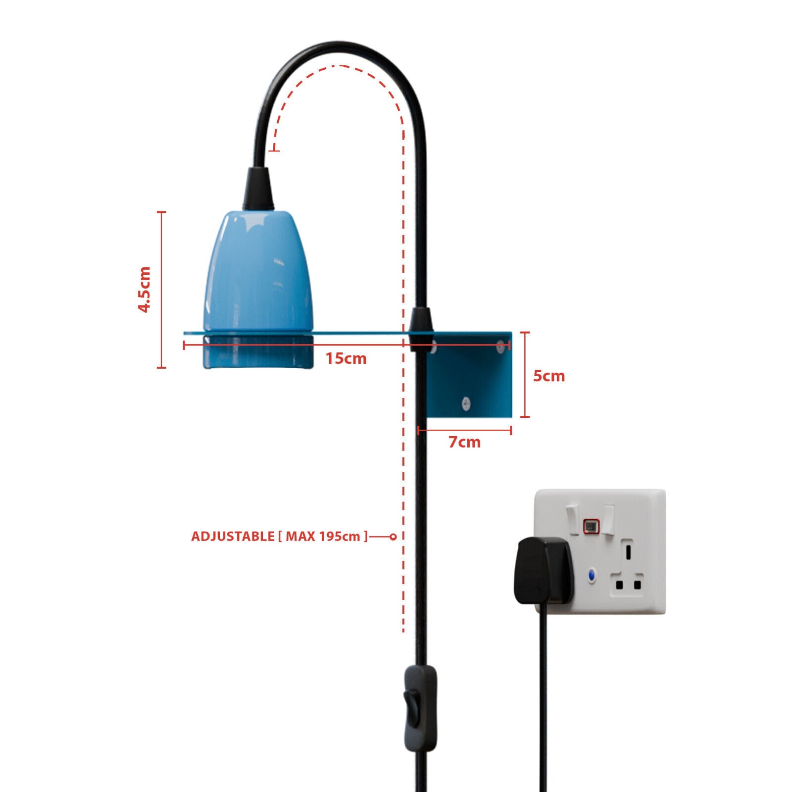 - Dimensions: Mounting plate: 7cm (W) × 5cm (H); Holder height: 4.5cm; Cable length: 195cm