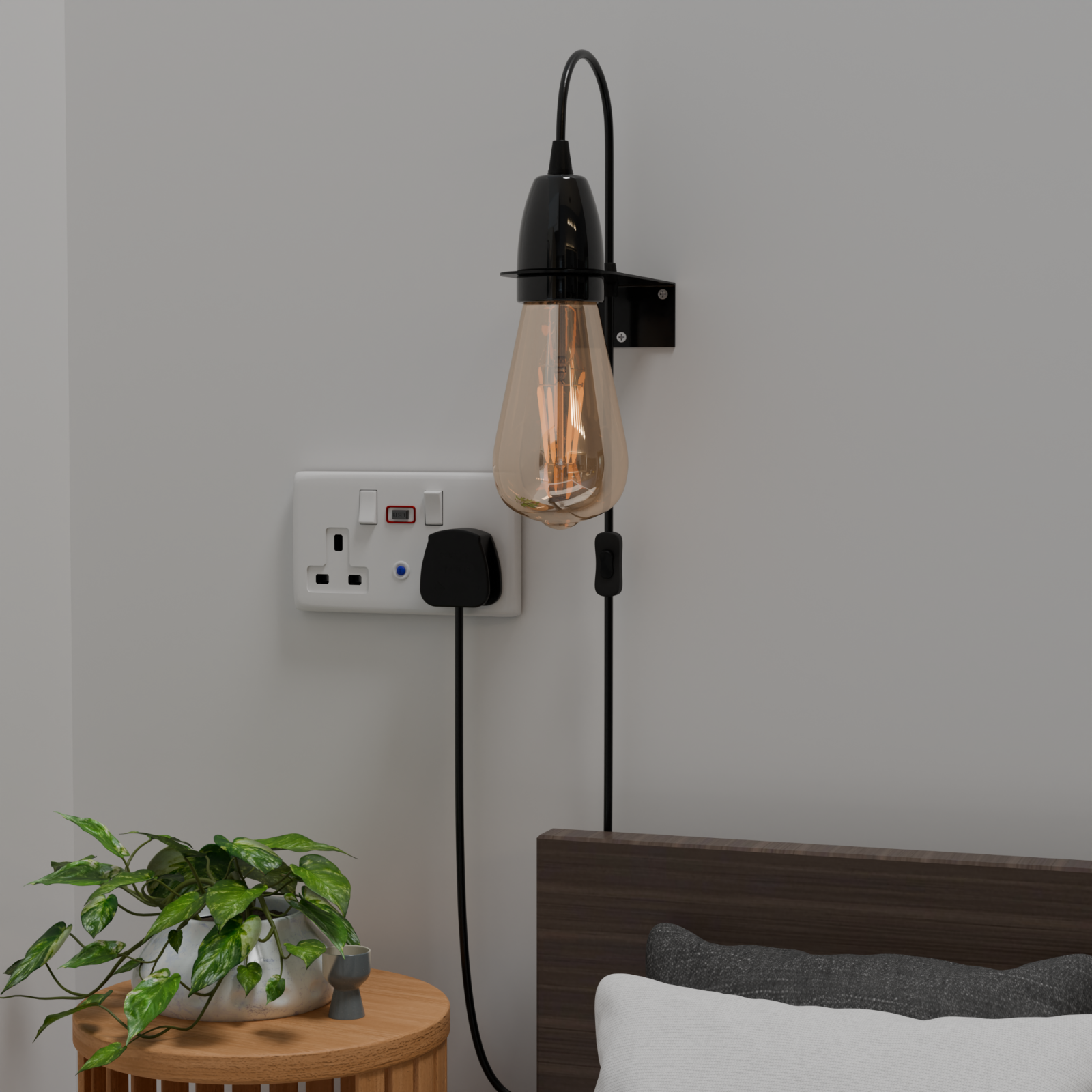 - Sleek, minimalist single-head wall light with a plugin PVC hanging cable and sturdy mounting plate.