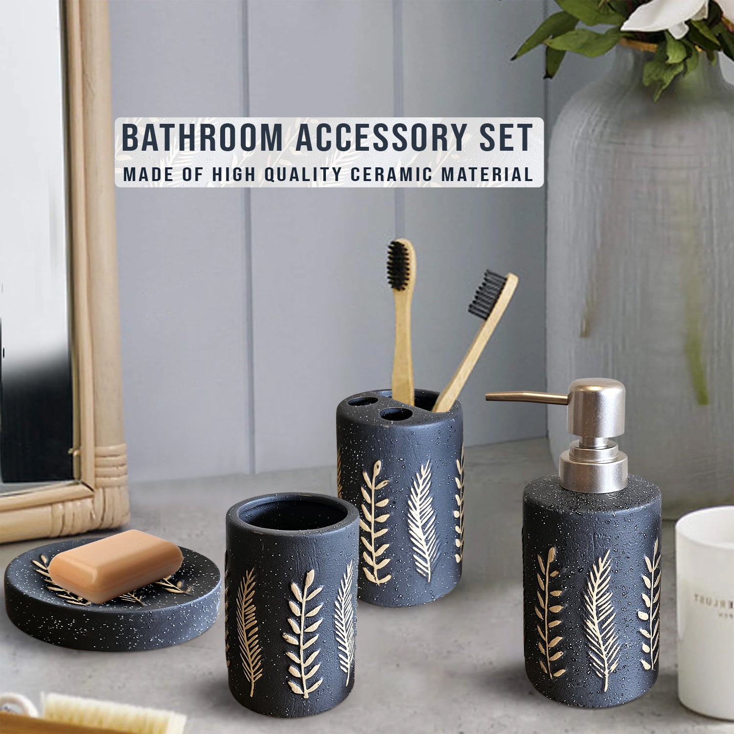 - Included components: Toothbrush Holder, Lotion Dispenser, Tumbler, Soap Dish