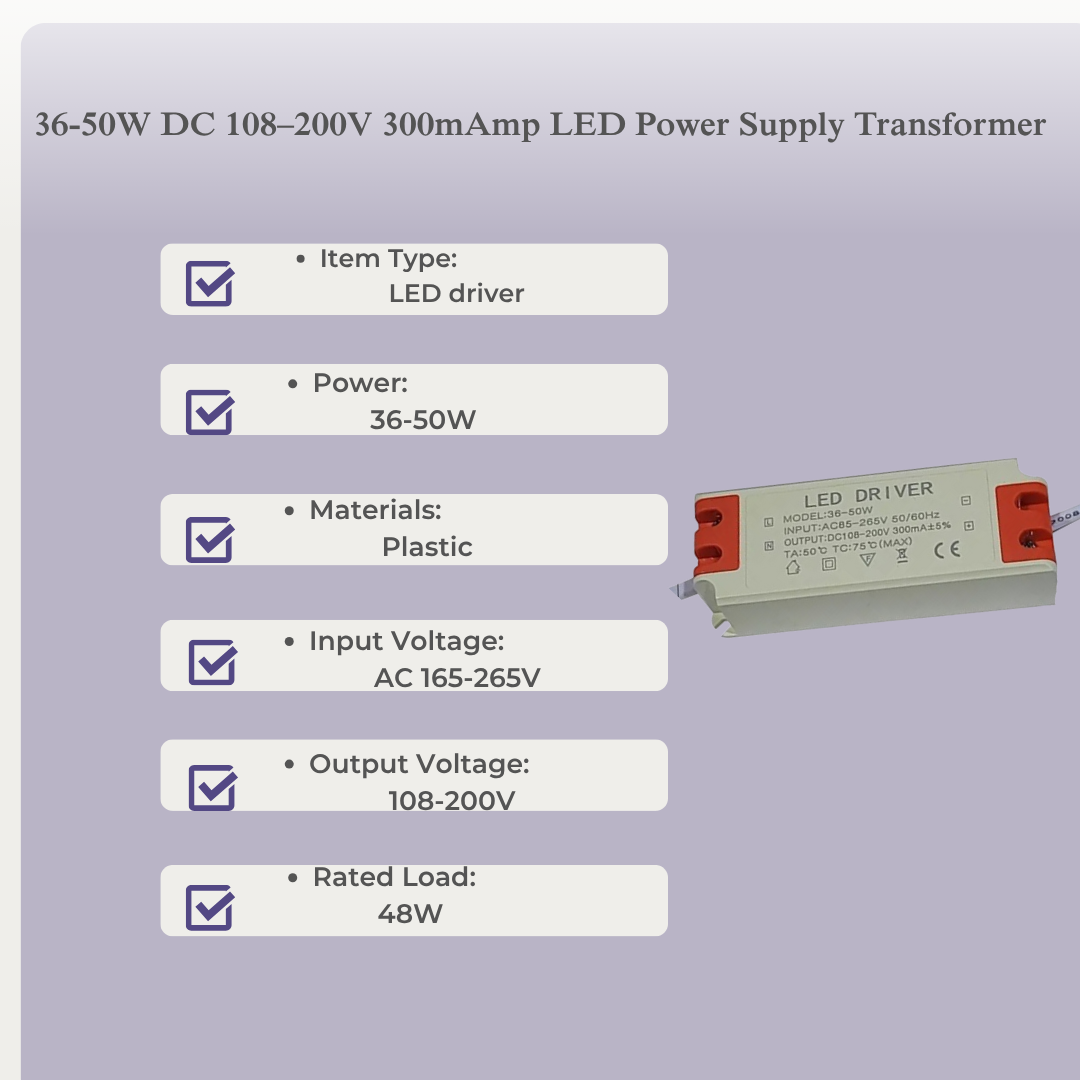 The LED Driver 36-50 Watt is a reliable power supply transformer designed for LED lighting applications. With a constant current output of 300mA, it ensures optimal performance and longevity for your LED fixtures. Operating within a voltage range of DC 108V–200V, this driver offers compatibility with a variety of LED set ups.