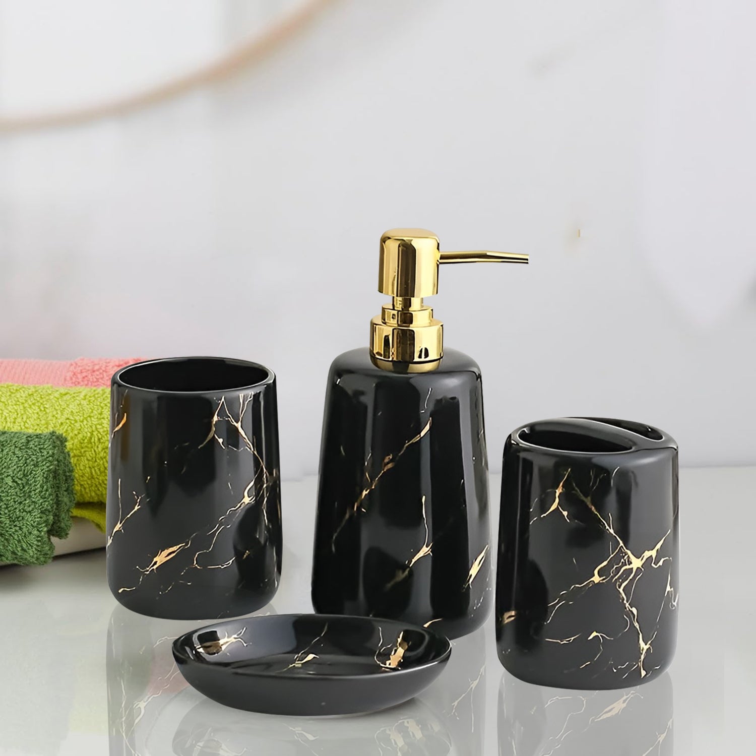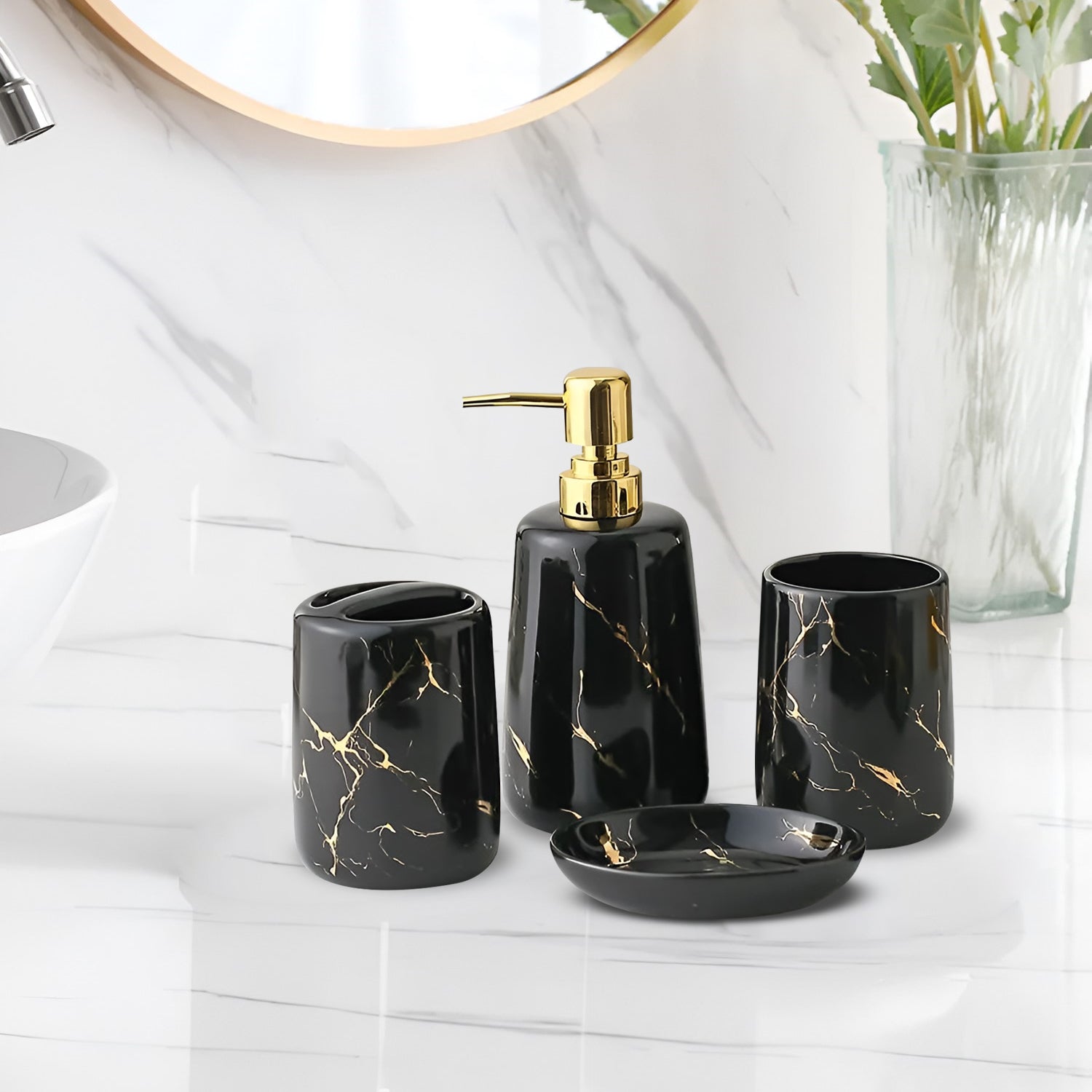 - This set, which includes a toothbrush holder, lotion dispenser, tumbler, and soap dish will elevate the ambience of your bathroom.