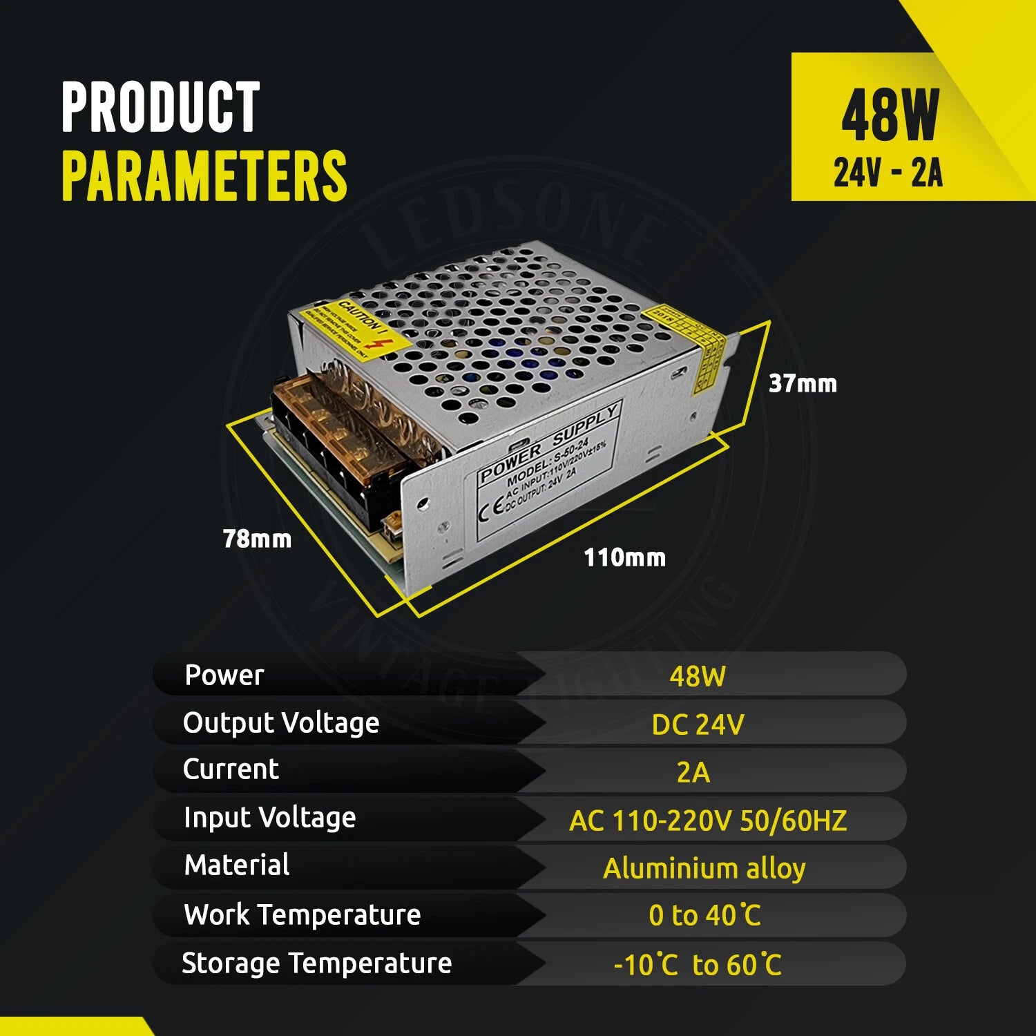 - This IP20 DC 24V switching power supply is widely used for low voltage LED strip light, RGB LED strip.