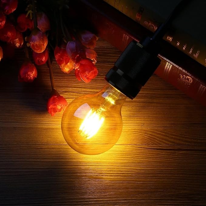 • The G95 LED filament bulb has a classic design with its globe shape and amber glass, allowing the filament to be displayed.