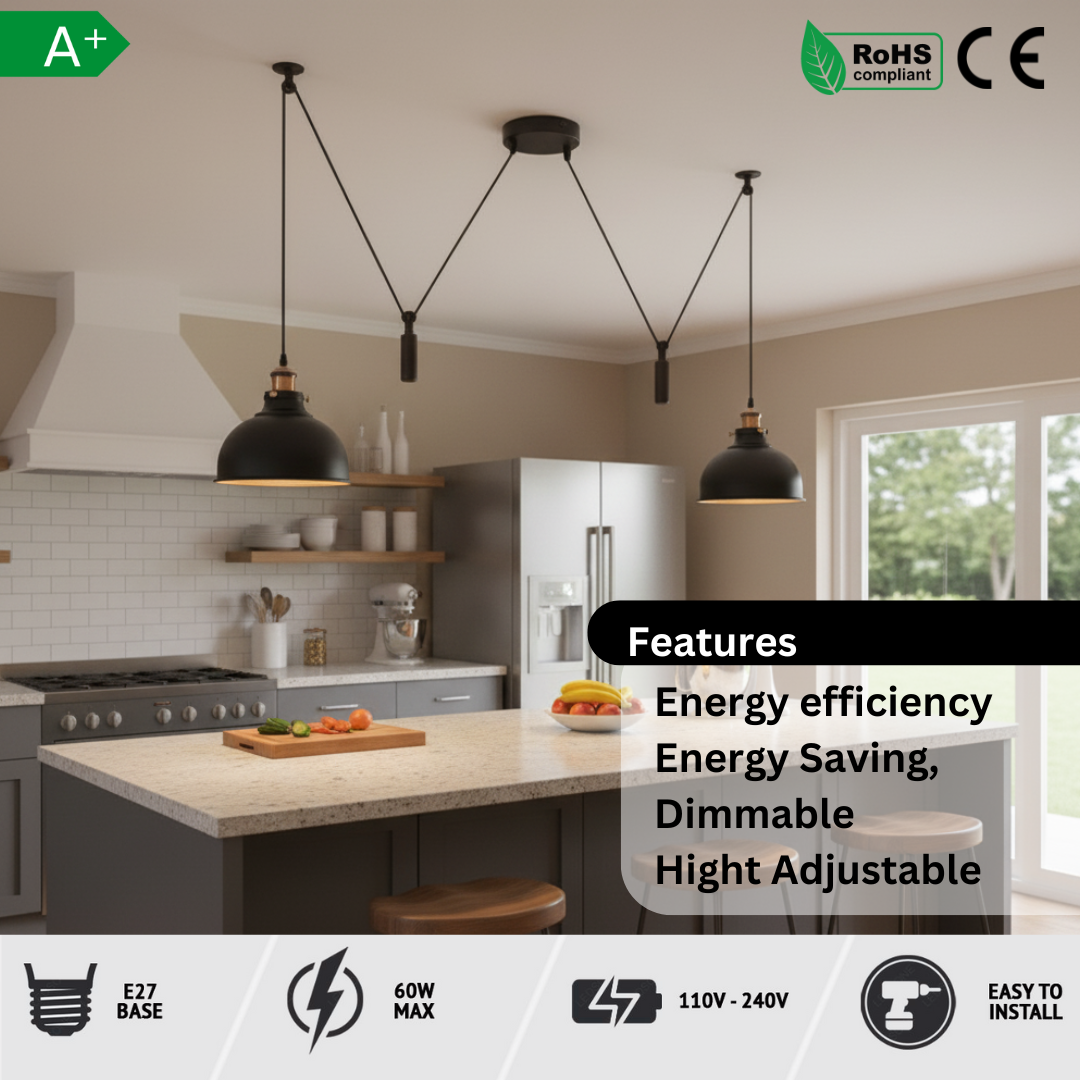 - This striking double pendant light with a twin pulley system is the ideal lighting over kitchen island, dining table, or even a billiard table.