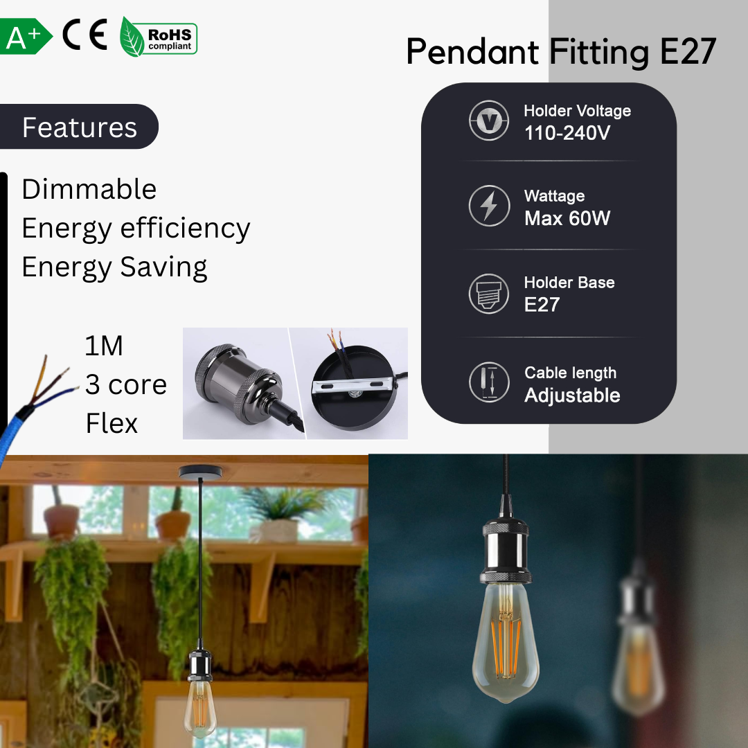 Pendant Set Light Fitting 3 Core E27 Adjustable Flex 1m ~1282
