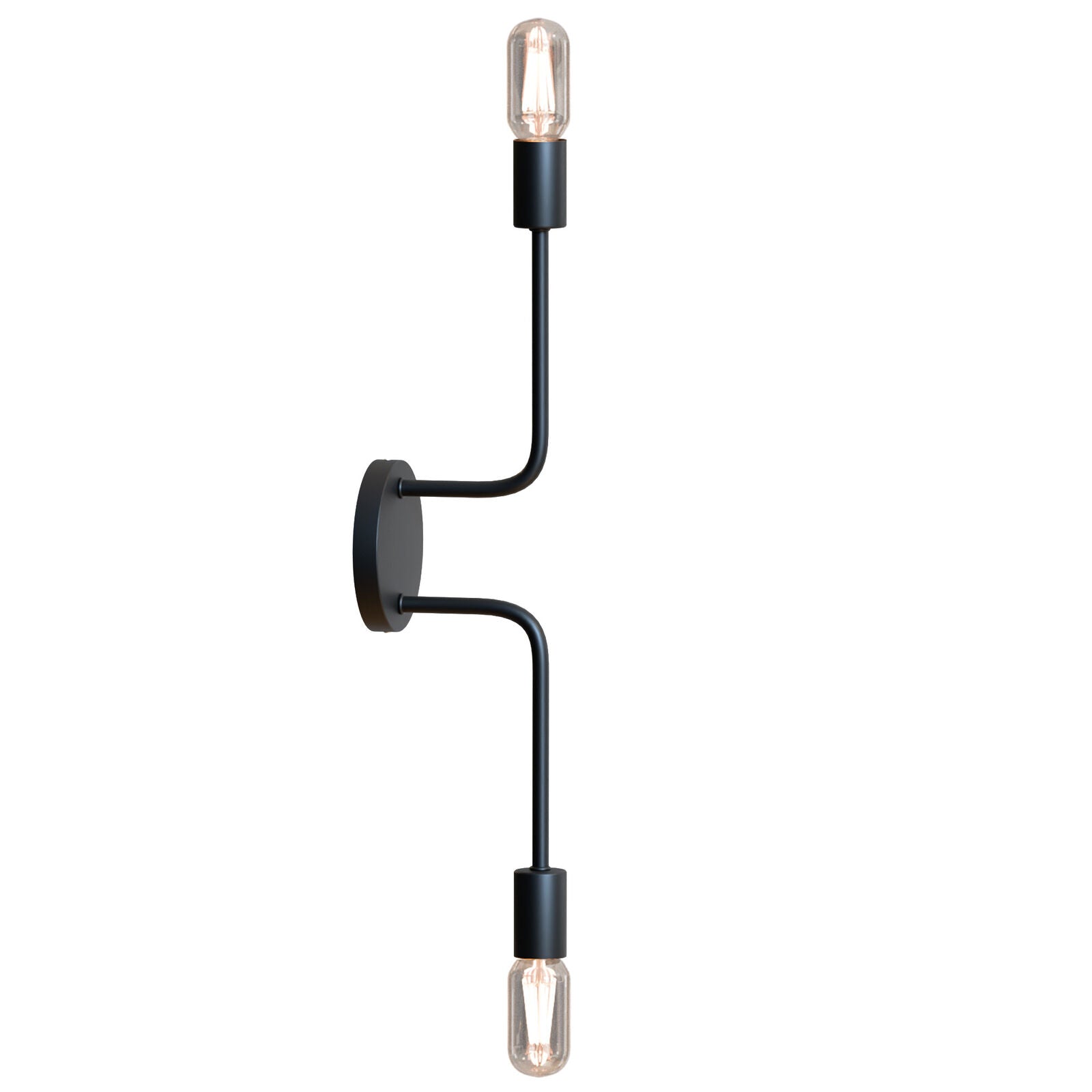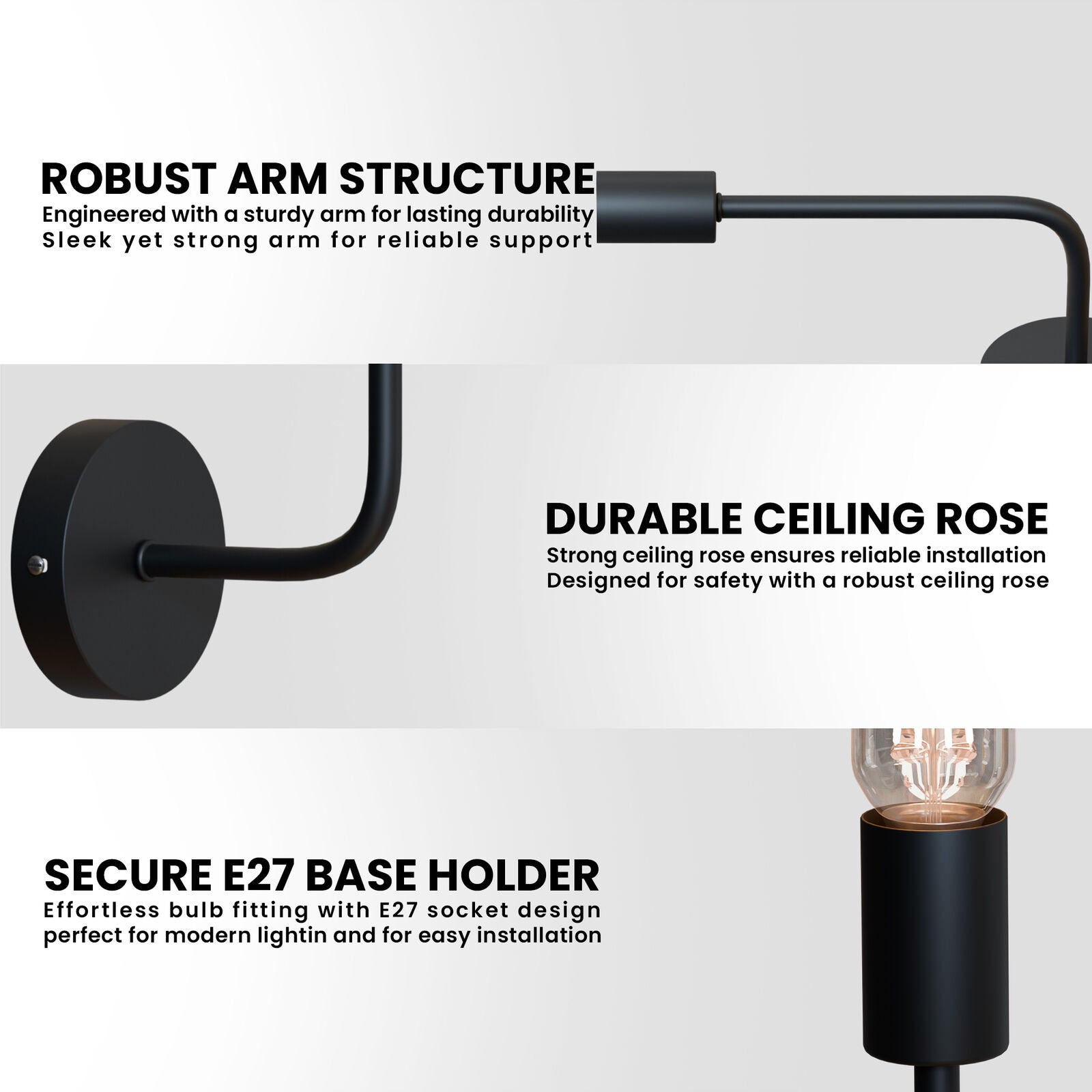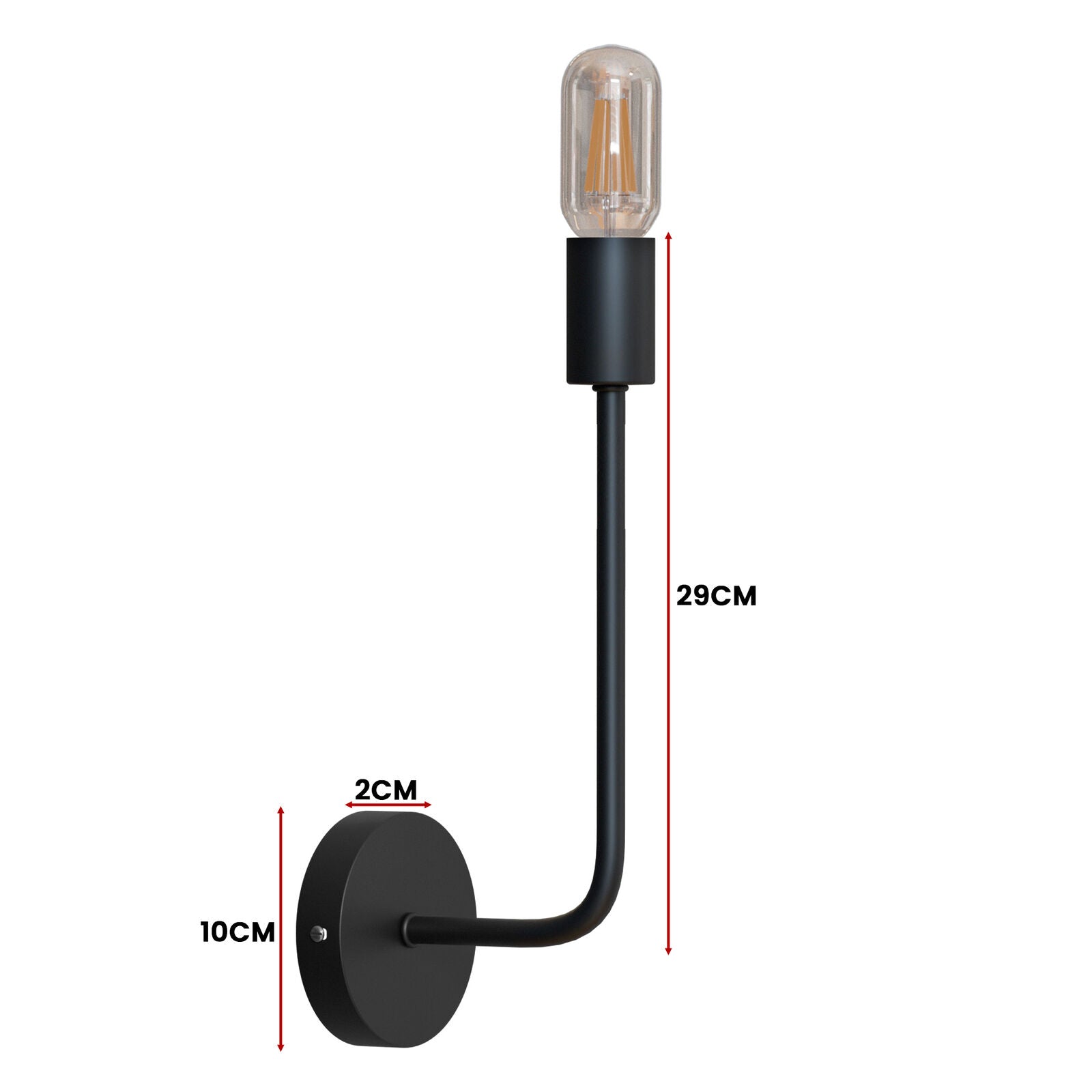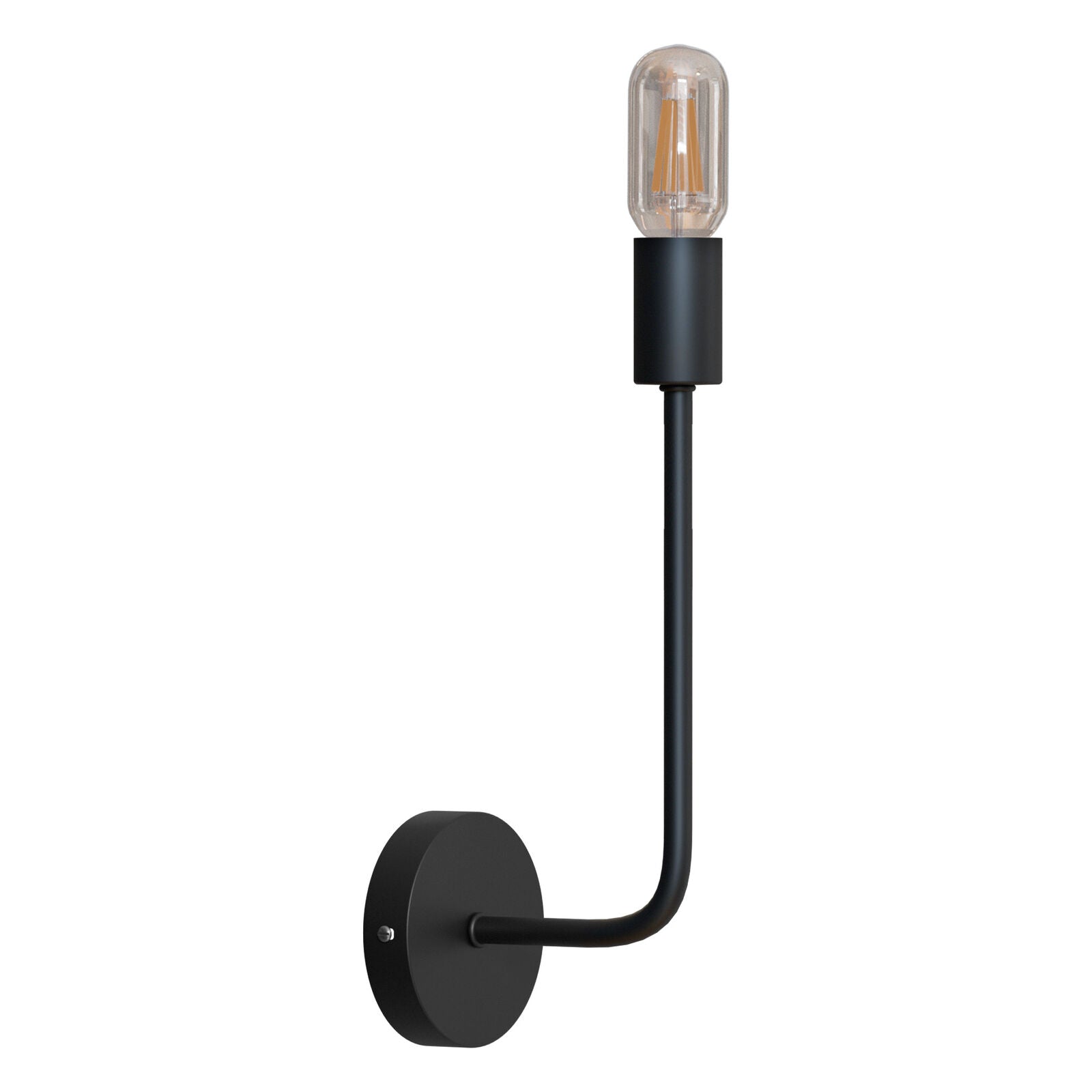 - This wall light features a curved metal arm, a cylindrical E27 socket, and a round 10 cm ceiling rose, designed with simple and practical geometry