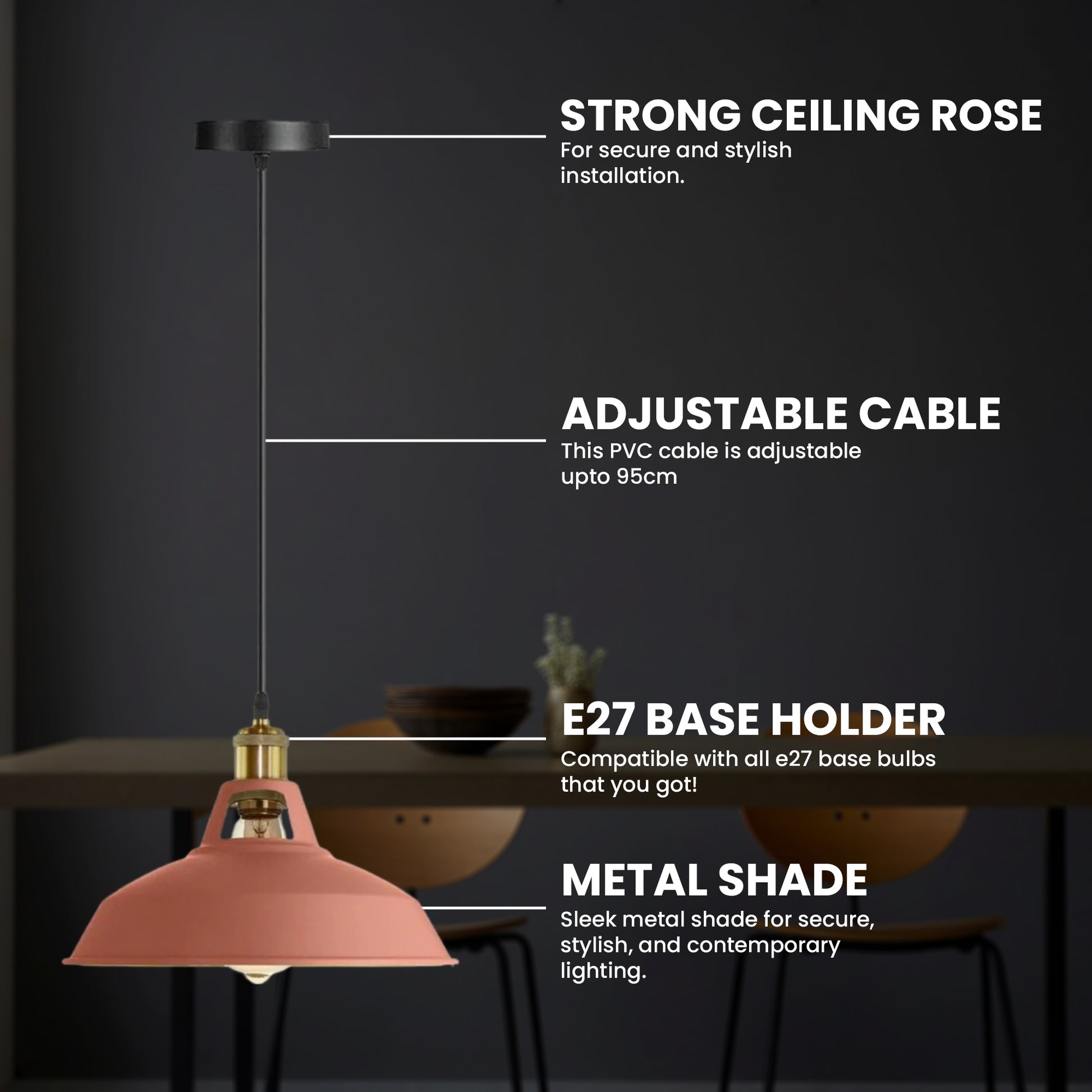 - 1 x Pendant Lampshade only. (1 x Lampshade, 1 x E27 Holder with wire, 1 x Ceiling rose with accessories).
