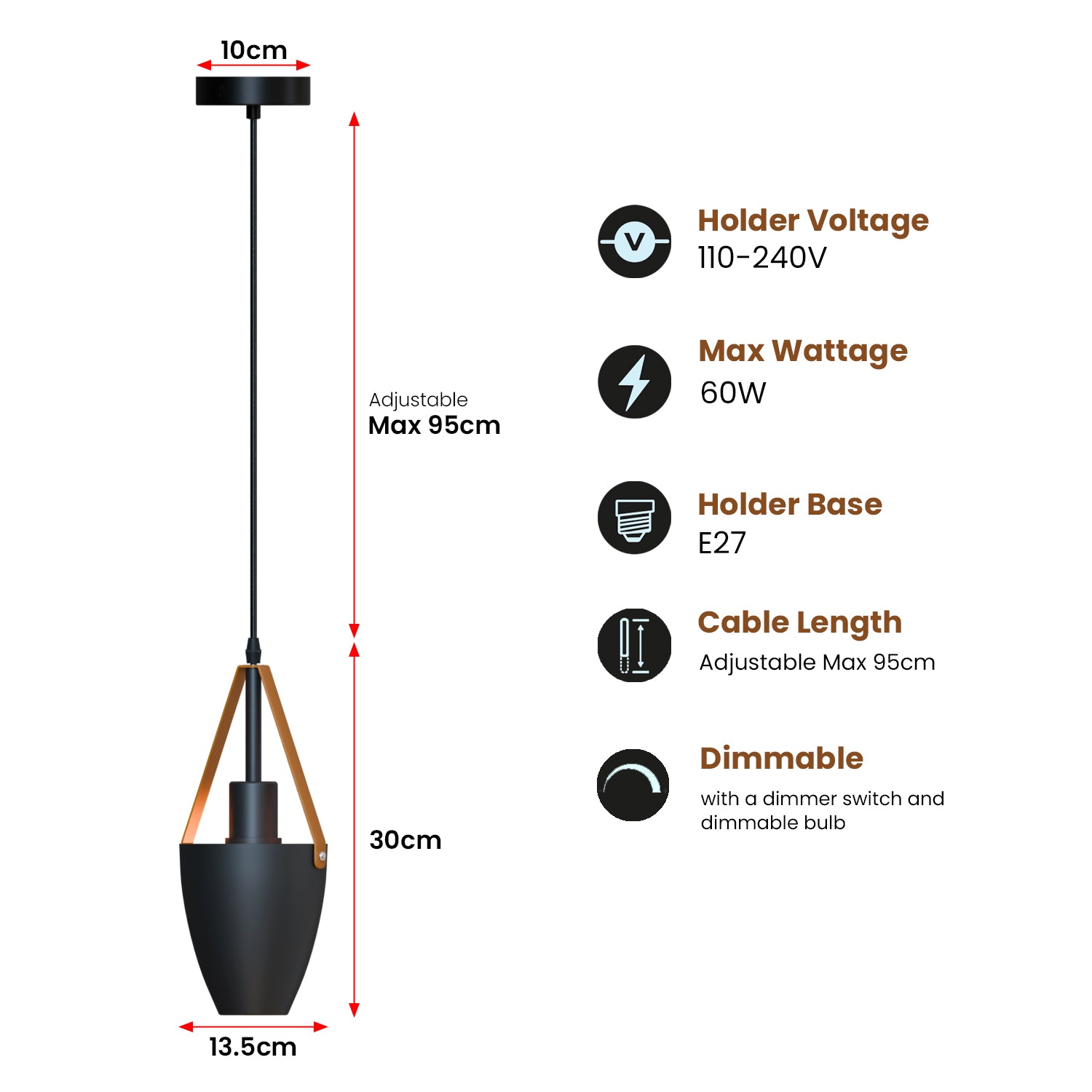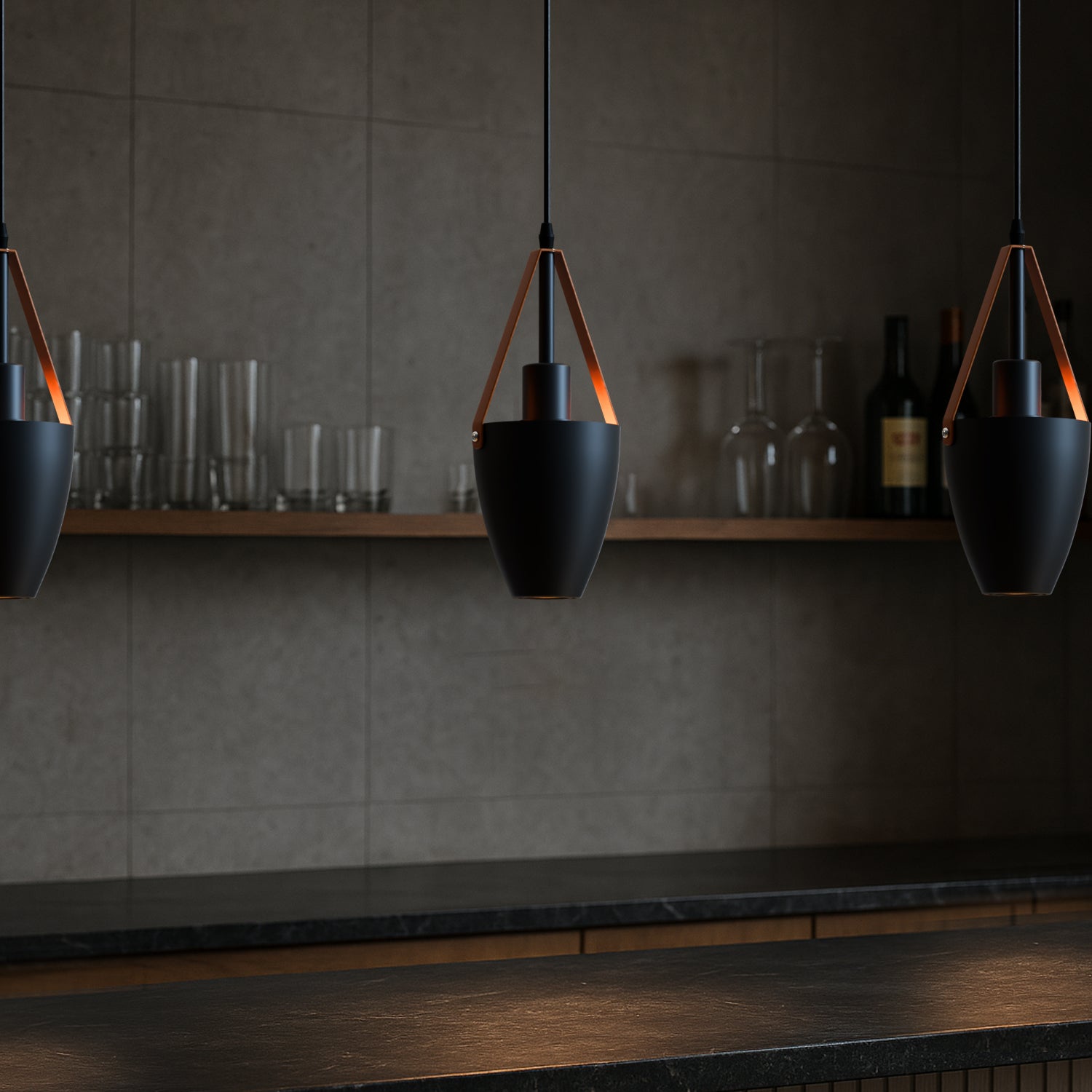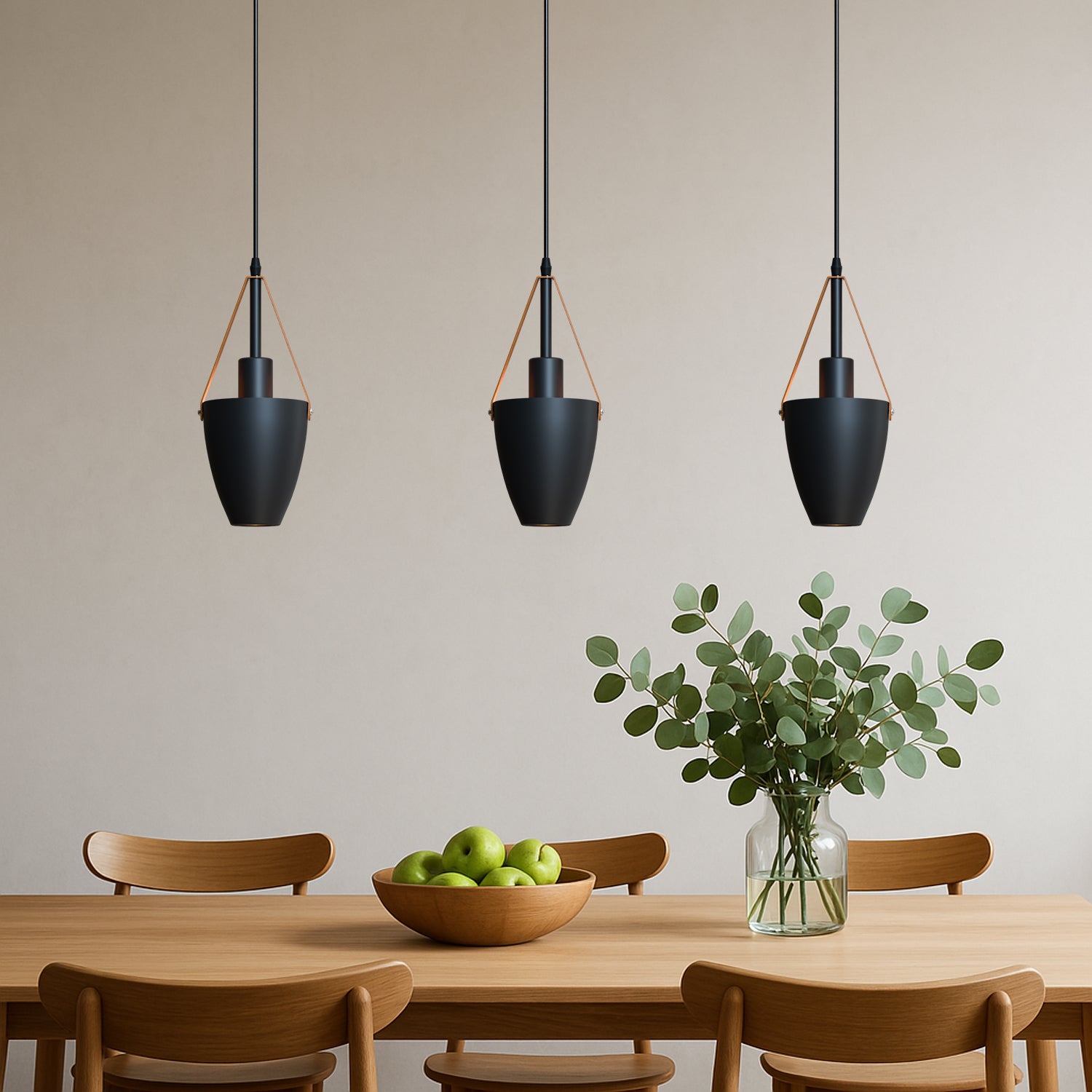 - This modern industrial pendant light features a matte black metal shade with a brown leather strap accent that holds the light fixture in place