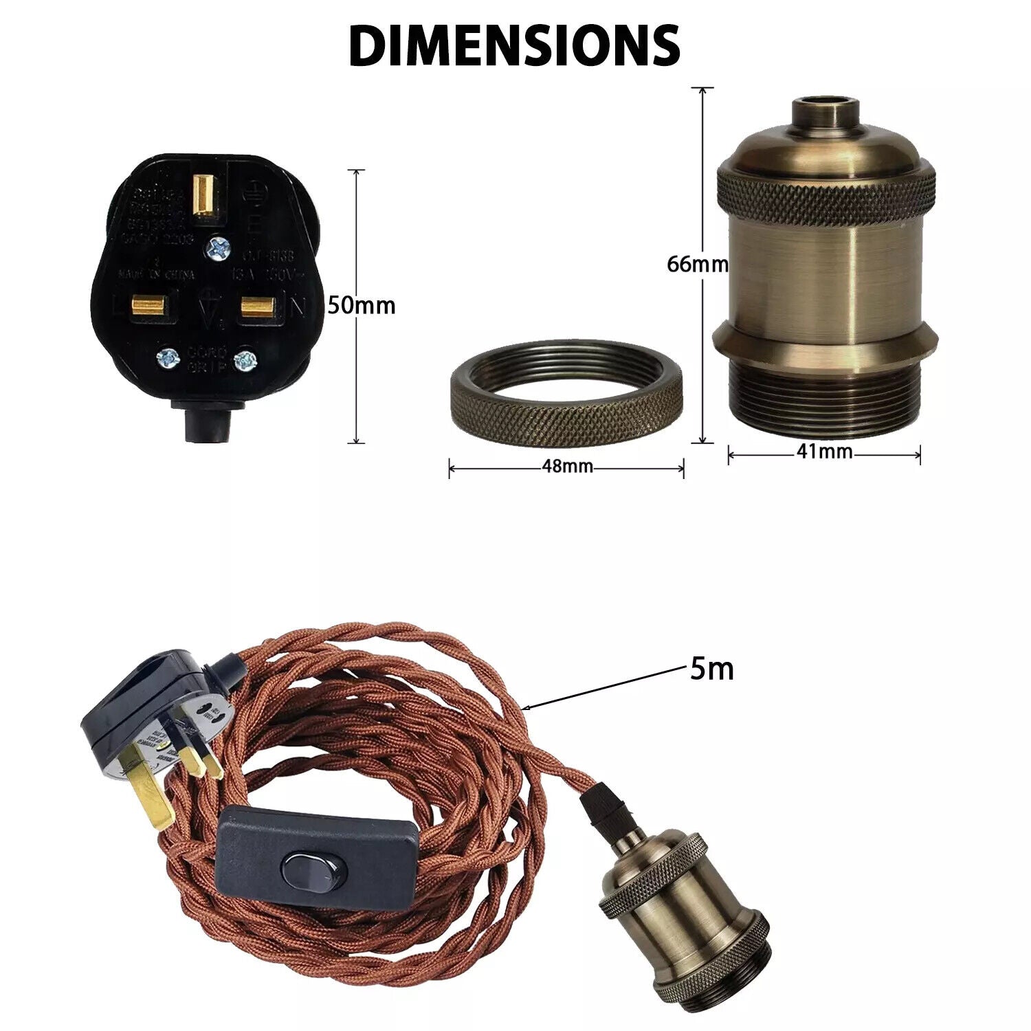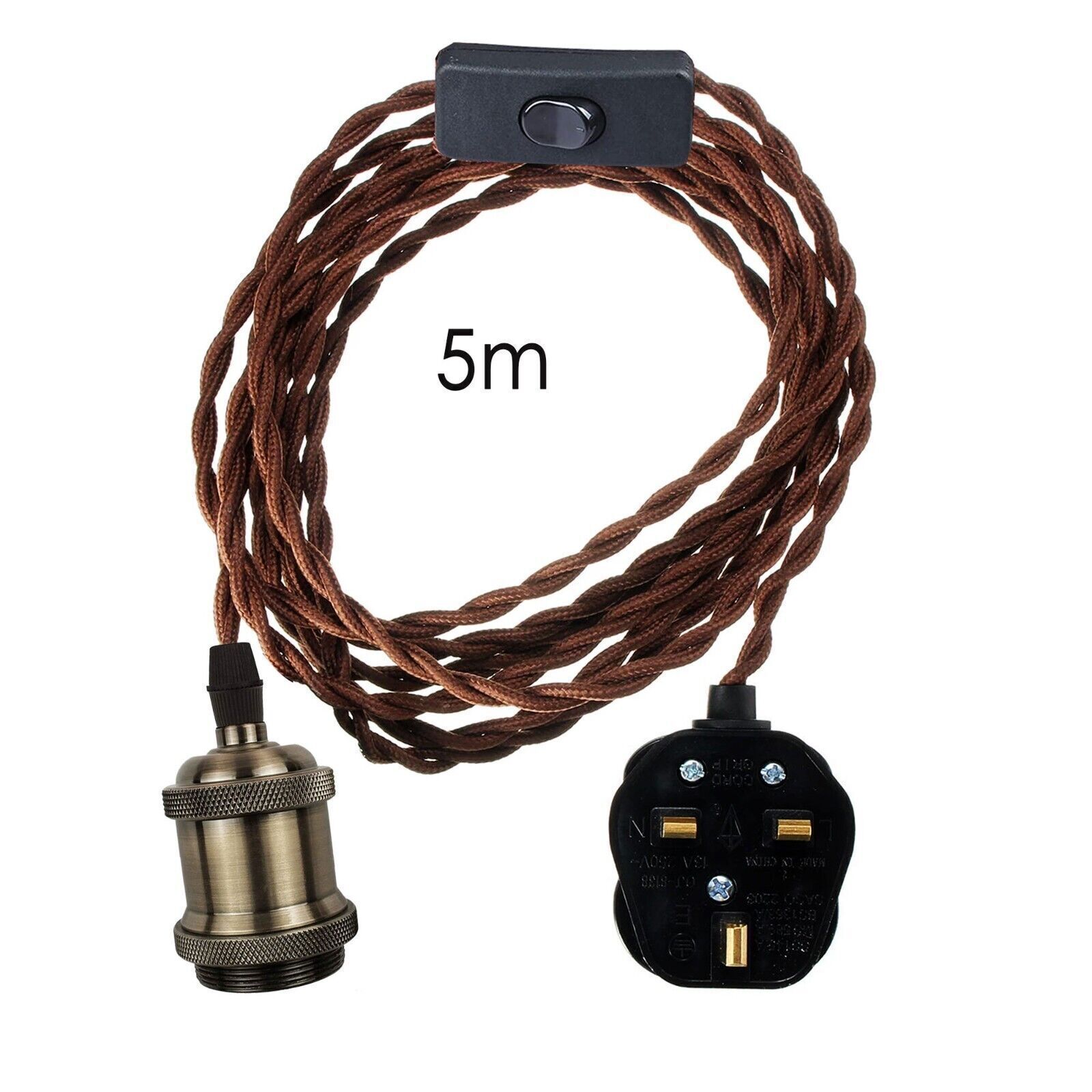 - 5 meters of 3 core fabric cable. Standard UK Plug socket, switch.