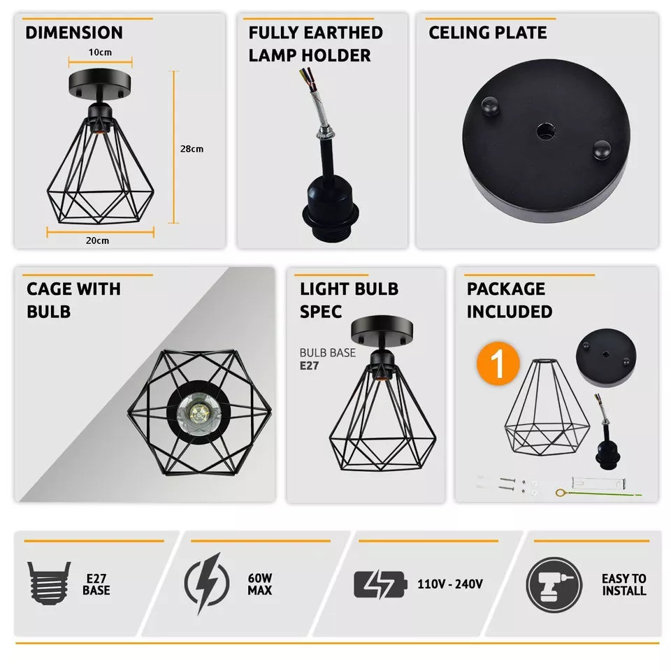 Vintage Ceiling Light Easy Fitting Metal Cage Flush Mount Lamp ~ 5999