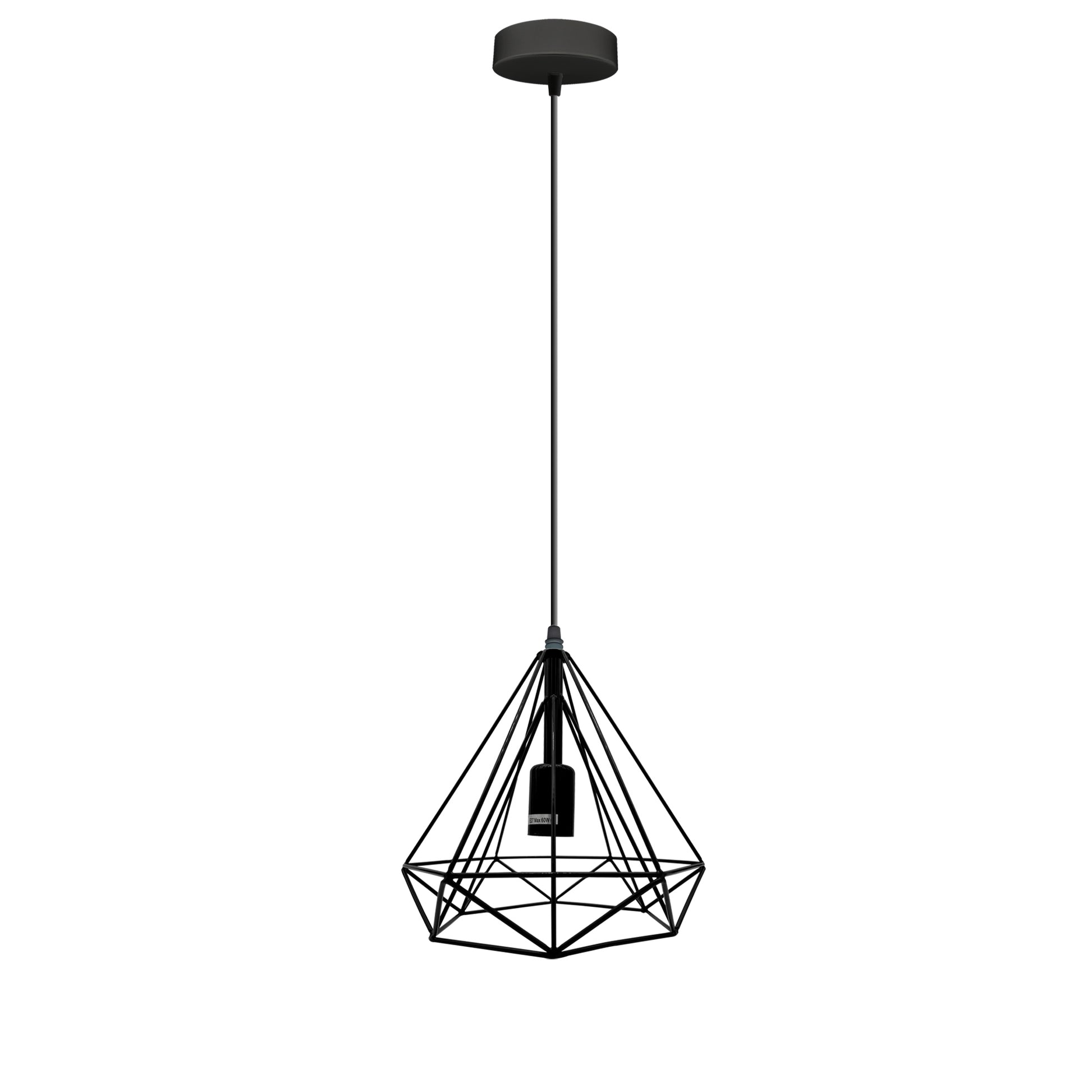 Black geometric pendant light hanging from a ceiling with a neutral wall background