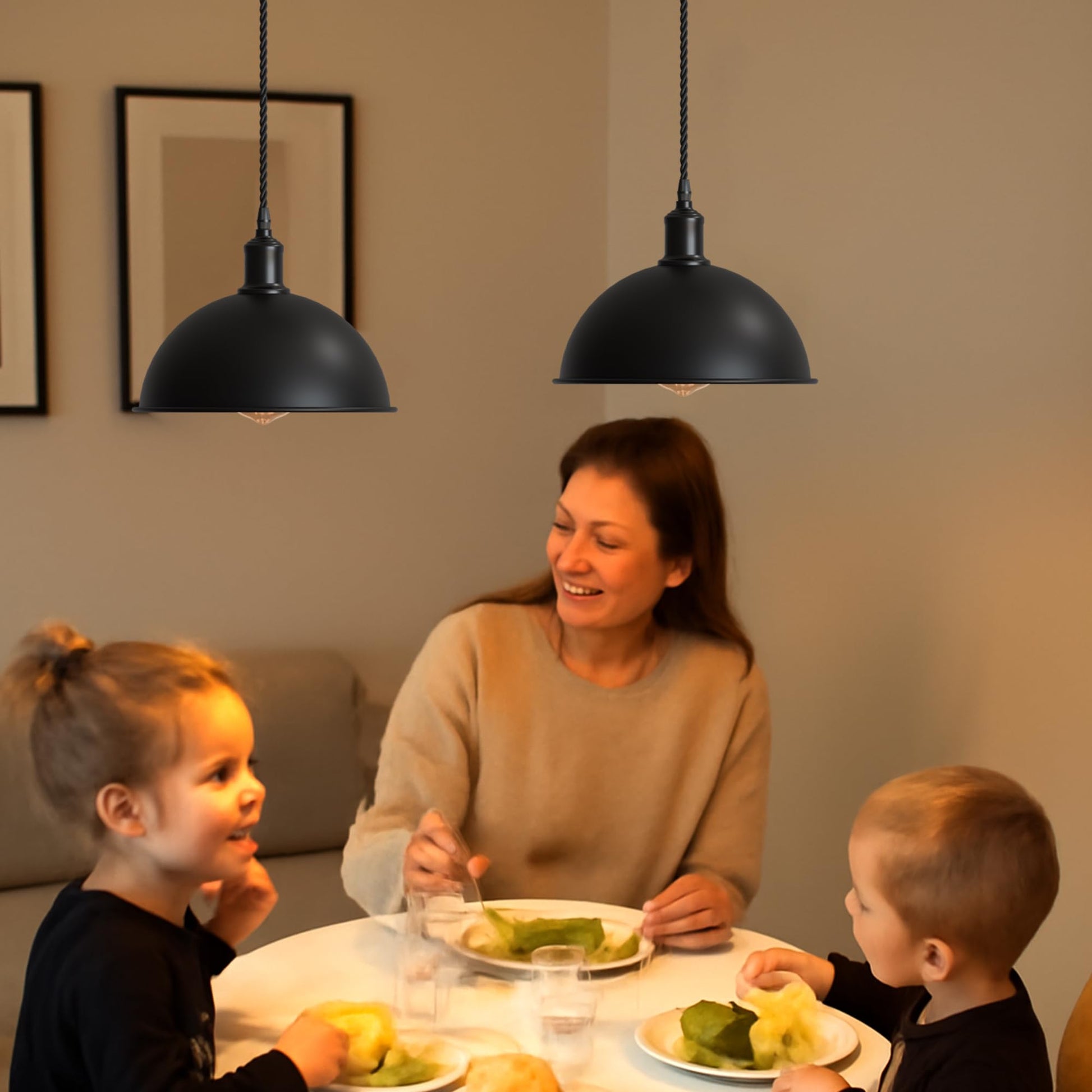 • Industrial farmhouse design with black dome shades for a modern, rustic look