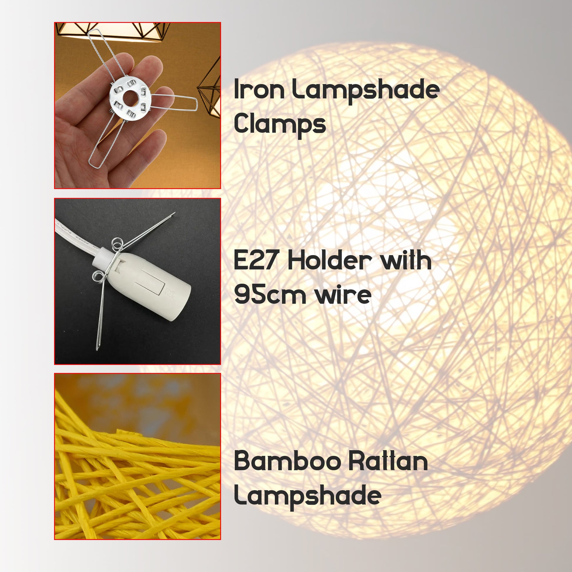 - 1 x Rattan Lampshade, E27 Holder with 95cm wire, Ceiling rose with fitting accessories
